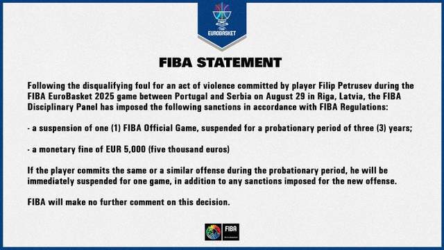 而在塞尔维亚与葡萄牙的比赛中,彼得鲁塞夫击打一名葡萄牙球员的腹部,被驱逐出场。这样的动作也获得了国际篮联纪律委员会的处罚通知:处以1场国际篮联官方赛事禁赛,但该禁赛处于3年缓刑期内,并罚款5000欧元。